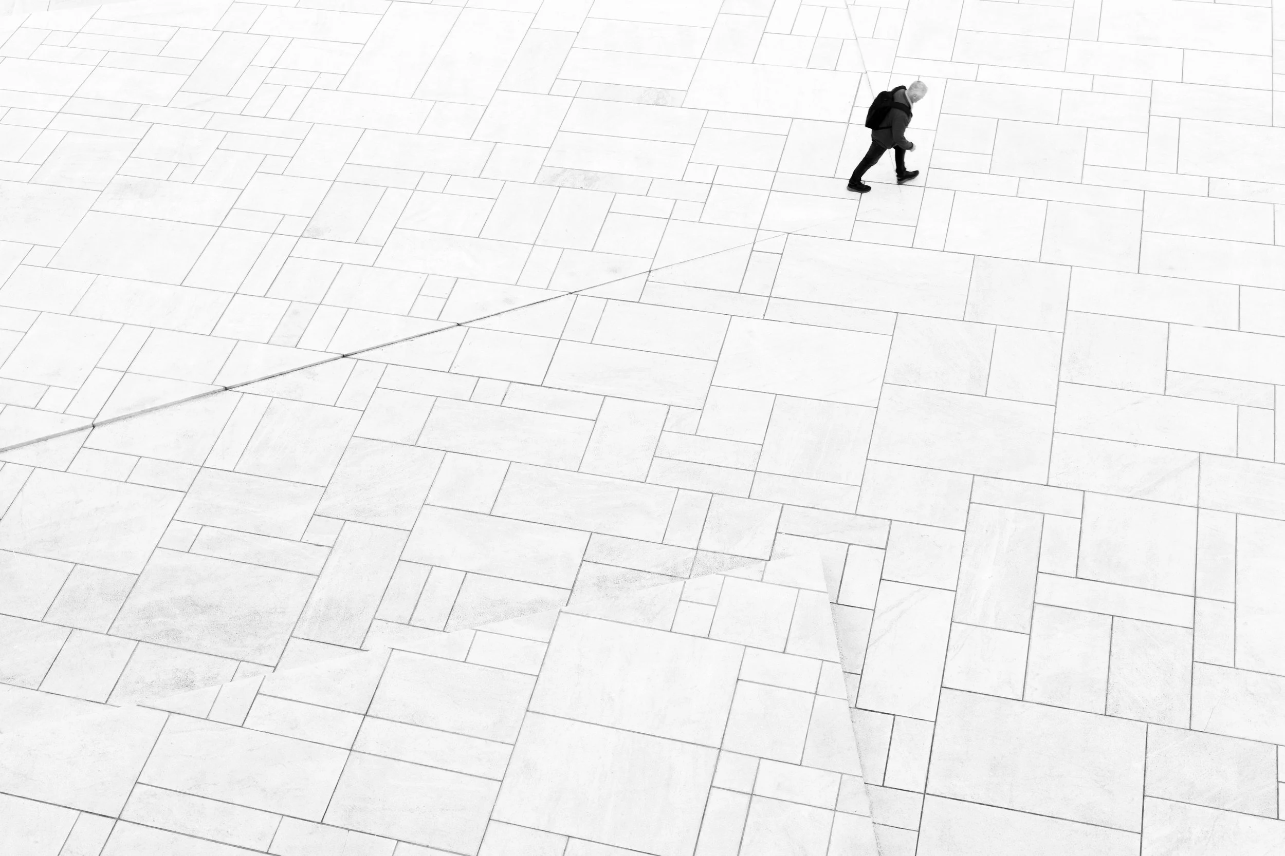 En gammel mann går alene over et landskap av brikker, flater og fragmenter. På ryggen bærer han sekken sin – som om den rommer et helt liv av minner, erfaringer, tap og håp. Han følger en linje som gradvis viskes ut, som et spor mellom fortid og det ukjente som ligger foran. Rundt ham ligger livet i biter: valg, hendelser, øyeblikk og veier som en gang var tydelige, men som nå bare kan sees i glimt. Bildet forteller om livets reise – om å fortsette å gå, selv når stien blir svakere, og om å bære med seg alt det som har formet et menneske.